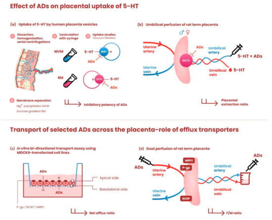 Graphical illustration of the research design and experimental models used in the study. The upper panel depicts methods employed to investigate the effects of antidepressants on placental uptake of 5-HT: (a) Human term placentas were dissected, homogenized, and subjected to serial centrifugation steps. Membrane separation was performed by Mg+ precipitation (microvillous membrane, MVM) and sucrose gradient (basal membrane, BM); subsequently, the membranes were spontaneously vesiculated by passaging through a 25-gauge needle. MVM and BM vesicles were used to evaluate the effects of antidepressants on SERT- and OCT3-mediated uptake of 5-HT, respectively. (b) To confirm our ex vivo findings on organ level, in situ perfused rat term placenta was employed to explore the effect of antidepressants on OCT3-mediated 5-HT uptake from the fetal circulation. The umbilical perfusion was carried out in an open-circuit setup. 5-HT with/without antidepressants was infused through the umbilical artery and the placental extraction ratio was calculated. Fetal sex was determined and considered as a potential factor. The lower panel shows methods used to investigate the role of ABC efflux transporters in transplacental passage of antidepressants: (c) monolayers of MDCKII cells stably transfected with P-gp, BCRP, or MRP2 were used to assess their role in transmembrane passage of [3H]paroxetine, [3H]citalopram, and [3H]sertraline. Net efflux ratios were calculated and normalized to efflux ratios in parental cells. (d) Transport of these drugs across the dually perfused rat placenta was tested in closed-circuit setup and the fetal/maternal concentration ratio at equilibrium was calculated. For detailed description of all experimental methods, see corresponding sections in Materials and Methods. ADs—antidepressants.
