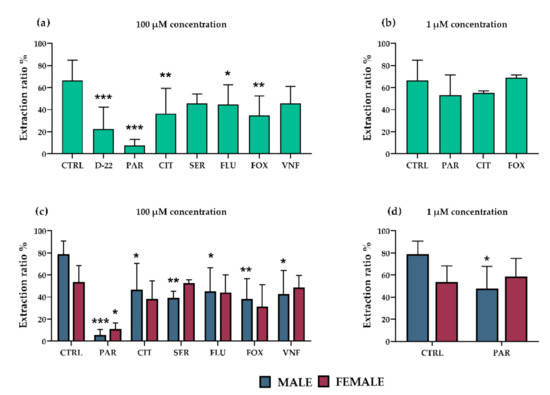 Effects of antidepressants on placental extraction of 5-HT from fetal circulation in rat placenta. Decynium 22 (10 µM) was used as a model inhibitor of OCT3. Several of the tested antidepressants significantly decreased extraction of 5-HT (relative to controls) from the fetal circulation at 100 µM concentration: most potently paroxetine, citalopram, and fluvoxamine (a). No significant effects of the antidepressants at 1 µM concentration were detected in analyses of samples of both fetal sexes (b). However, male placentas were affected more than female placentas at both tested concentrations (c,d). The values are mean ± SD; n = 4 dams for each condition (4 females/4 males). Differences between samples exposed to the antidepressants and unexposed controls were evaluated by one-way ANOVA with Dunnet’s multiple comparisons test (a,b). Two-way ANOVA with Sidak’s multiple comparisons test was used to evaluate the fetal sex-dependence of the antidepressants’ effects (c,d): * (p ≤ 0.05), ** (p ≤ 0.01), *** (p ≤ 0.001). Abbreviations: CTRL—Controls, D-22—decynium 22, PAR—paroxetine, CIT—citalopram, SER—sertraline, FLU—fluoxetine, FOX—fluvoxamine, VNF—venlafaxine.
