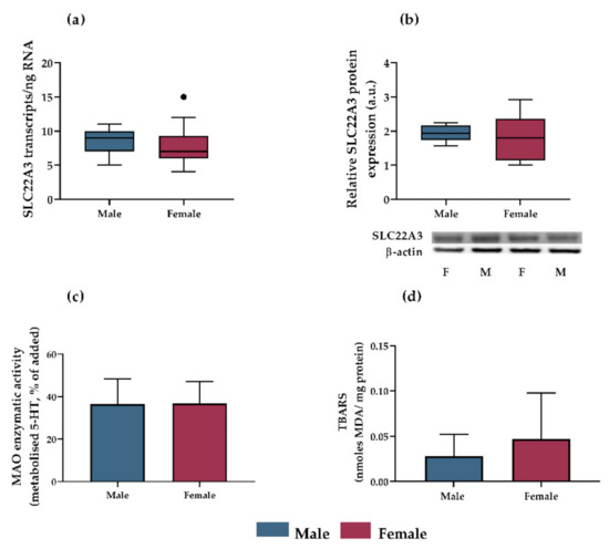 Several potential mechanisms were investigated to help identify the sex-dependent inhibition of 5-HT extraction observed in rat placenta. OCT3 gene and protein expression was analyzed in perfused placentas by ddPCR and western blot, respectively. However, no significant differences were observed between male and female placentas (Figure 4a,b). In addition, sex-dependent placental MAO-A activity and lipid peroxidation were determined, as a potential mechanism affecting transporter function [52]. No sex-dependent differences in MAO-A activity or lipid peroxidation were noted (Figure 4c,d).