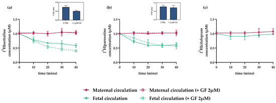 Interactions of citalopram, paroxetine, and sertraline (at 1 µM) with placental efflux transporters were tested in situ using the closed-circuit perfusion setup and GF120918 (2 µM) as a model inhibitor of P-gp and BCRP. The citalopram concentration in fetal circulation did not change during the experiment, with the F/M concentration ratio at equilibrium remaining close to 1 (Figure 5c). In contrast, fetal circulation concentrations of sertraline and paroxetine steadily decreased, resulting in F/M concentration ratios at equilibrium of 0.58 and 0.61, respectively (Figure 5a,b). These results suggest active efflux of the antidepressants from the fetal to maternal circulation. Nevertheless, addition of GF 120918 (2 µM) did not affect the efflux, suggesting involvement of efflux transporters other than P-gp or BCRP.
