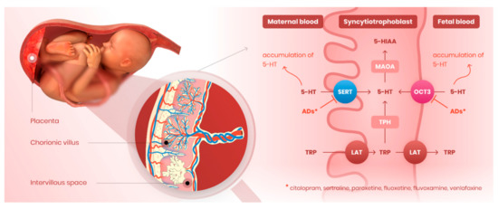 Depression is one of the most frequent complications during pregnancy. Estimates of its prevalence vary significantly, but recent data indicate that up to 20% of pregnant women experience depression and/or anxiety [1]. Moreover, epidemiological studies have detected negative effects of untreated depression during gestation on pregnancy outcomes [2]. Thus, currently up to 13% of pregnant women are prescribed one or more antidepressants, most commonly selective serotonin reuptake inhibitors (SSRIs) and serotonin/noradrenaline reuptake inhibitors (SNRIs) [3,4]. These drugs inhibit reuptake of serotonin (5-hydroxytryptamine, 5-HT) in neuronal cells by blocking its specific transporters in the presynaptic membrane, thus increasing extra-neuronal 5-HT concentrations in the brain. However, SSRIs/SNRIs can also cross the placental barrier and affect 5-HT homeostasis in the fetoplacental unit, thus compromising placental functions and fetal development [5,6]. Therefore, use of antidepressants by pregnant women remains controversial.