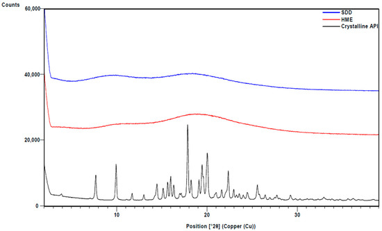 XRPD of HME and SDD solid dispersions. Crystalline API is also shown for comparison.