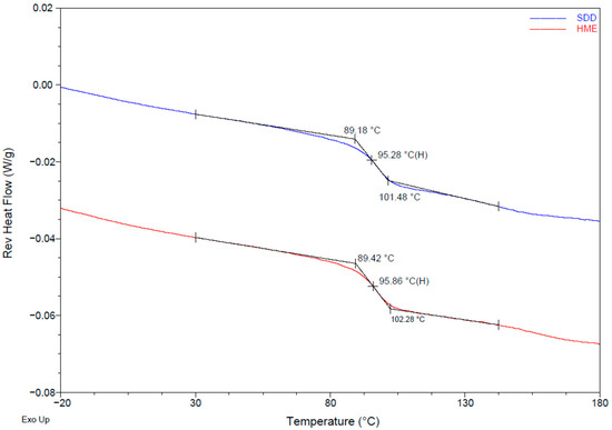 mDSC of HME and SDD solid dispersions shown as reversing heat flow with Tg.