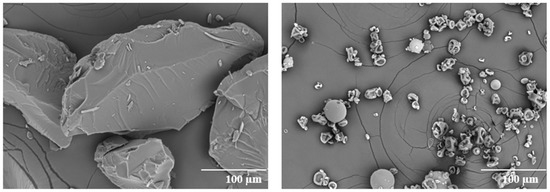 The morphology of the ASDs was characterized by SEM (Figure 3). The particles of the HME dispersion show a larger irregular shape with a relatively smooth surface. The SDD particles have raisin-like morphology with smaller particle size. The particle size observed in SEM is consistent with particle size analysis, which gave D50 = 22 µm for SDD and D50 = 157 µm for HME.
