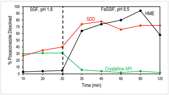 In order to understand the effectiveness of formulating a compound as an amorphous solid dispersion in increasing bioavailability, two-stage biorelevant dissolution can be used to predict the in vivo performance of an oral solid dosage form, using media to mimic the composition and conditions a dosage form would encounter as it moves through the gastrointestinal system. The first stage represents the conditions encountered in the stomach and uses simulated gastric fluid (SGF) with a pH of 1.8. The dosage form is stirred in this solution for 30 min, simulating the amount of time the dosage form would be in the stomach. The API has a relatively high crystalline solubility in this media (~0.79 mg/mL); however, the polymer in the ASD, HPMCAS-MF, has low solubility in acidic media. In amorphous solid dispersions, HPMCAS acts to prevent the posaconazole from dissolving, resulting in a delay in the release of the drug until more basic pH values are reached. In amorphous solid dispersions with high surface areas (smaller particle size) or with high concentrations of API on the surface, the HPMCAS cannot effectively stop the API from dissolving, resulting in the release of the API in the gastric stage [20]. Release of the drug in the stomach has limited benefits, as absorption of the drug into the bloodstream typically occurs after the dosage form is emptied into the intestinal tract. As seen in Figure 4, the HME solid dispersion effectively limits the amount of posaconazole dissolving in the gastric solution. In contrast, SDD shows some release in the SGF, with nearly 40% of the SDD API dissolved after 30 min.