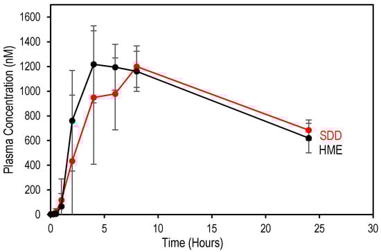 Mean posaconazole blood plasma concentrations following administration of SDD and HME formulations at 5 mg/kg body weight in cynomolgus monkey (n = 6).