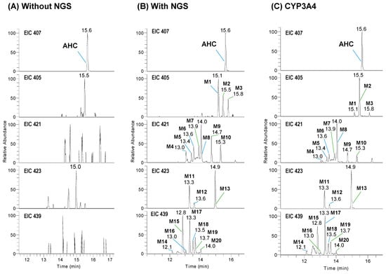 To identify the phase I metabolites of AHC in HLMs, 10 µM AHC was incubated in pooled HLMs without or with the NGS for 60 min. The total ion chromatogram showed that when AHC was incubated in HLMs in the presence of the NGS, AHC was reduced. AHC decreased rapidly with the same trend as the metabolic stability results, and peaks presumed to be metabolites were generated (Figure S1). The extracted ion chromatograms of the generated AHC metabolites are shown in Figure 2A,B. AHC was detected as a deprotonated ion, [M − H]−, at m/z 407 and 15.6 min in the negative ion mode. All compounds presented a stronger intensity in the negative ion mode than that in the positive mode. After incubation for 60 min in the presence of the NGS, 20 metabolites were produced; deprotonated ions were observed at m/z 405 (M1–M3) by dehydrogenation at 15.1–15.8 min, m/z 421 (M4–M10) by dehydrogenation and oxidation at 13.0–15.3 min, m/z 423 (M11–M13) by mono-oxidation at 13.3–14.9 min, and m/z 439 by dioxidation (M14–M20) at 12.1–14.0 min.