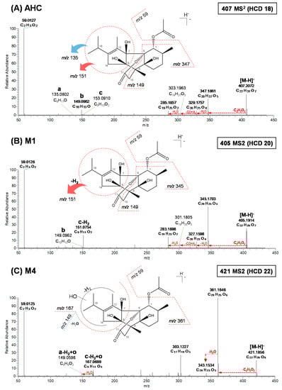 M1, M2, and M3 were observed at m/z 405.1914–405.1915 (C22H29O7), which were 2 Da (-H2) less than deprotonated AHC, indicating dehydrogenation of the parent ion (Table S1). The MS2 patterns of M1 and M2 were the same. M1 and M2 produced seven common product ions at m/z 345.1703, 327.1598, 301.1805, 283.1698, 151.0754, 149.0962, and 59.0126 (Figure 3B and Figure S2A). Five product ions at m/z 345.1703 (C20H25O5), 327.1598 (C20H23O4), 301.1805 (C19H25O3), 283.1698 (C19H23O2), and 59.0126 (C2H3O2) yielded the loss of C2H4O2 from AHC, loss of H2O from m/z 345.1703, loss of CO and gain of H2 from m/z 327.1598, loss of H2O from m/z 301.1805, and loss of the carbonyl moiety, respectively. Another two major product ions of M1 and M2 were observed at m/z 151.0754 (c-H2) and m/z 149.0962 (b). The product ion at m/z 151 was formed by dehydrogenation at the isopropyl-methylcylopentane moiety, and the fragment at m/z 149 was the same as that observed in deprotonated AHC.