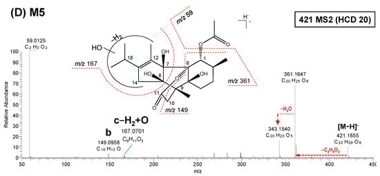 M5 and M10 had the same MS2 patterns (Figure 3D and Figure S3B). The product ions of M5 were detected at m/z 361.1647 (C20H25O6), 343.1540 (C20H23O5), 167.0701 (C9H11O3), 149.0958 (C10H13O), and 59.0125 (C2H3O2). Two major product ions at m/z 149.0958 (C10H13O) and 167.0701 (C9H11O3) were confirmed. The product ion at m/z 149 (b) was the same as that observed in deprotonated AHC. In contrast, the fragment at m/z 167 (c-H2 + O) was formed by dehydrogenation and oxidation at the isopropyl-methylcylopentane moiety.