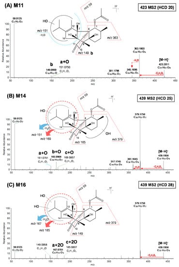 MS/MS spectra of deprotonated M11 (A), M14 (B), and M16 (C) obtained using a high-resolution quadrupole-orbitrap mass spectrometer. HCD, higher-energy C-trap dissociation.