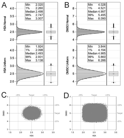 Histograms illustrating the effect of ±10% dispensing inaccuracy from either a normal distribution or uniform distribution for HSA (A) and DMSO (B). Scatter plots representing the Monte Carlo simulations for normal centred (C) and uniform (D) distributions. Statistical simulations were performed using the SAS System for Windows, release 9.4.