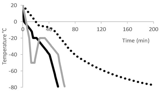 Example freezing rate profiles used to cryopreserve T cell. Dotted black line = passive freezing [63]; solid black line = CRF with 5-min hold time at −20 °C (dissipate heat of crystallisation) [65]; solid gray line = CRF with annealing step from −50 to −20 °C followed by a 10-min hold.