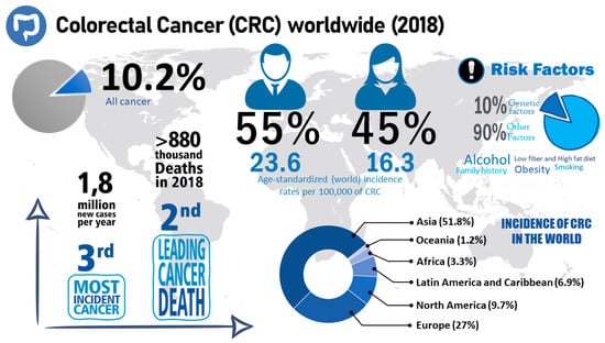 - Nguyen, H.T.; Duong, H.Q. The molecular characteristics of colorectal cancer: Implications for diagnosis and therapy (Review). Oncol. Lett. 2018, 16, 9–18. [Google Scholar] [CrossRef] [Green Version]