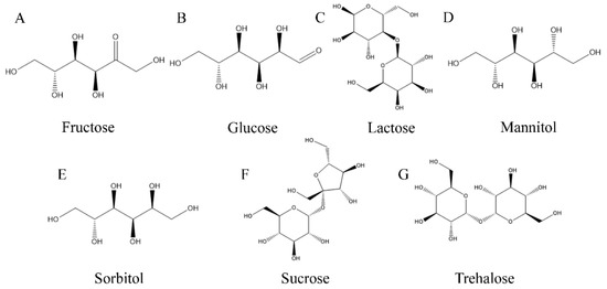 Chemical structure of (A) Fructose, (B) Glucose, (C) Lactose, (D) Mannitol, (E) Sorbitol, (F) Sucrose, and (G) Trehalose.