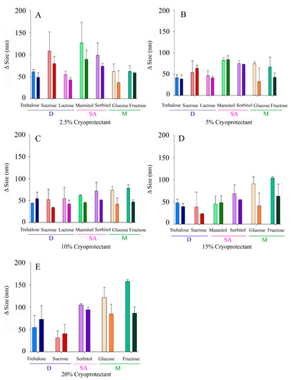Increase in the sizes of the NLCs (Δ Size) after lyophilization with different CPs at variable concentrations: (A) 2.5% w/v, (B) 5% w/v, (C) 10% w/v, (D), 15% (w/v), (E) 20% w/v. Light colours correspond to slow freezing processes and dark colours to fast freezing processes. The CPs are grouped according to their type into disaccharides (D), sugar alcohols (SA), and monosaccharides (M).