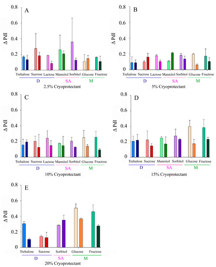 Increase in the polydispersity index of the NLCs (Δ PdI) after lyophilization with different CPs at variable concentrations: (A) 2.5% w/v, (B) 5% w/v, (C) 10% w/v, (D), 15% (w/v), (E) 20% w/v. Light colours correspond to slow freezing processes and dark colours to fast freezing processes. The CPs are grouped according to their type into disaccharides (D), sugar alcohols (SA), and monosaccharides (M).