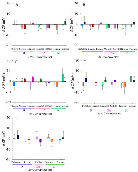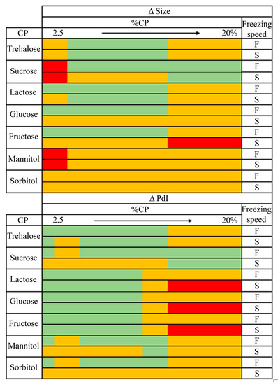 In contrast, a narrower results’ range of −5–+5 mV and −4–+7 mV was reported for Δ ZP using fast or slow freezing, respectively (Figure 4). In this case, positive increases were considered to be more relevant than negative ones, due to the impact that they could have over colloidal stability. However, only slight neutralizations were found with some CPs, such as lactose, fructose, or trehalose.