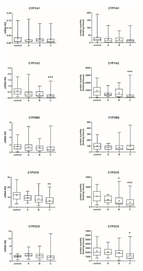 (also see page up) Gene expression (left) and protein abundance (right) of CYPs in hepatic tissues stratified according to the Child–Pugh score into stages: A (n = 18), B (n = 31) and C (n = 28). The data are represented as box-plots of the median (horizontal line), 75th (top of box), and 25th (bottom of box) quartiles, the smallest and largest values (whiskers) and mean (+) are shown. mRNA levels of the analyzed genes were expressed as relative amounts to the mean of five housekeeping genes (GAPDH, HMBS, PPIA, RPLP0, RPS9). Statistically significant differences: * p < 0.05, ** p < 0.01, *** p < 0.001 (Kruskal–Wallis test post hoc Dunn’s test with Bonferroni correction) in comparison to the controls.