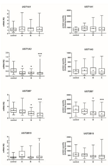Gene expression (left) and protein abundance (right) of UGTs in hepatic tissues stratified according to the Child–Pugh score into stages: A (n = 18), B (n = 31) and C (n = 28). The data are represented as box-plots of the median (horizontal line), 75th (top of box), and 25th (bottom of box) quartiles, the smallest and largest values (whiskers) and mean (+) are shown. mRNA levels of the analyzed genes were expressed as relative amounts to the mean of five housekeeping genes (GAPDH, HMBS, PPIA, RPLP0, RPS9). Statistically significant differences: * p < 0.05, *** p < 0.001 (Kruskal–Wallis test post hoc Dunn’s test with Bonferroni correction) in comparison to the controls.