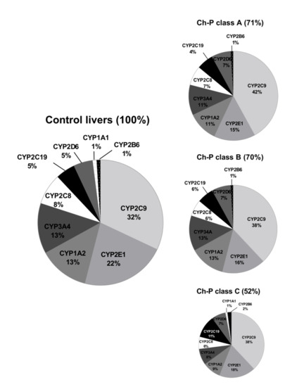 The percentage contributions of all investigated CYP proteins stratified according to the different Child–Pugh scores are given in Figure 3. Although the protein amounts and rank order of the enzymes were markedly affected by the liver functional states, CYP2C9 and CYP2E1 showed the highest abundances, while CYP2B6 was only found in traces (~1–2%) in all liver pathologies (Figure 3, Table S3). Interestingly, CYP1A1 could be only detected in the control and the Child–Pugh score C livers at very low levels (1%).