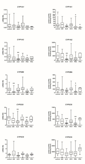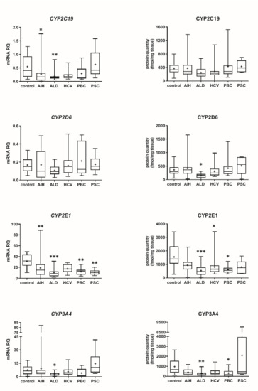 (also see page up) Gene expression (left) and protein abundance (right) of CYPs in hepatic tissues from hepatitis C (HCV, n = 21), primary biliary cholangitis (PBC, n = 10), primary sclerosing cholangitis (PSC, n = 6), alcoholic liver disease (ALD, n = 20) and autoimmune hepatitis (AIH, n = 20) patients and the controls (n = 20). The data are represented as box-plots of the median (horizontal line), 75th (top of box), and 25th (bottom of box) quartiles, the smallest and largest values (whiskers) and mean (+) are shown. mRNA levels of the analyzed genes were expressed as relative amounts to the mean of five housekeeping genes (GAPDH, HMBS, PPIA, RPLP0, RPS9). Statistically significant differences: * p < 0.05, ** p < 0.01, *** p < 0.001 (Kruskal–Wallis test post hoc Dunn’s test with Bonferroni correction) in comparison to the controls.