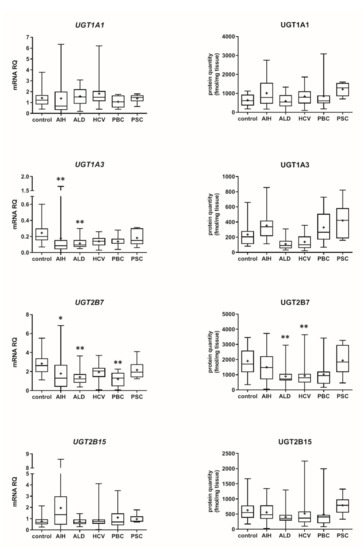 Gene expression (left) and protein abundance (right) of UGTs in hepatic tissues from hepatitis C (HCV, n = 21), primary biliary cholangitis (PBC, n = 10), primary sclerosing cholangitis (PSC, n = 6), alcoholic liver disease (ALD, n = 20) and autoimmune hepatitis (AIH, n = 20) patients and the controls (n = 20). The data are represented as box-plots of the median (horizontal line), 75th (top of box), and 25th (bottom of box) quartiles, the smallest and largest values (whiskers) and mean (+) are shown. mRNA levels of the analyzed genes were expressed as relative amounts to the mean of five housekeeping genes (GAPDH, HMBS, PPIA, RPLP0, RPS9). Statistically significant differences: * p < 0.05, ** p < 0.01 (Kruskal–Wallis test post hoc Dunn’s test with Bonferroni correction) in comparison to the controls.