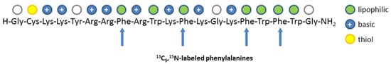 Sequence of Pep19-2.5. The arrows indicate the positions of the 13C9,15N1-labeled phenylalanine residues incorporated in the solid phase peptide synthesis.