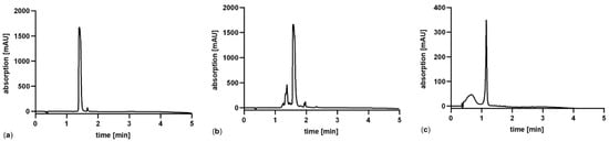 HPLC-analysis after acidic hydrolysis of aromatic amino acids (a) phenylalanine, (b) tryptophan and (c) tyrosine for 24 h at 120 °C. The original concentration of each amino acid prior hydrolysis was 1 mg/mL.