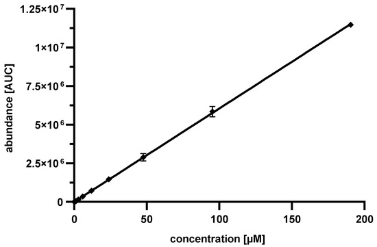 In the subsequent step, a 13C9,15N1 phenylalanine standard curve, as shown in Figure 5, was determined for concentrations between 0.74 and 190.48 µM. The values detected were in excellent accordance with the linear plot. At lower concentrations, a reliable detection of 13C9,15N1 phenylalanine was not possible.