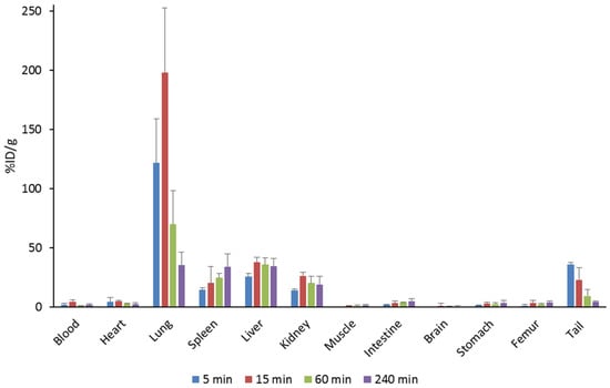 The results for organ distribution of 14C-labeled Pep19-2.5 are shown in Figure 7. The peptide initially accumulates in the lungs resulting in high %ID/g values. The activity in the lungs decreased significantly after 15 min, whereas this case was not as strong in the other organs. Significant amounts of the peptide were located in spleen, liver, kidney and tail. %ID/g values for the spleen and intestine doubled over 4 h. Sixty minutes post injection, the activity was almost completely cleared from the blood. When considering the whole organs, the majority of the peptide was found in the liver over the entire measurement period (46 to 69%ID). A small portion was also found in the kidneys (Figure 8a,c).