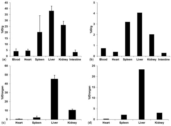 (a) %ID/g for 14C-labeled Pep19-2.5 organ distribution in NMRI mice, (b) %ID/g 2H-labeled Pep19-2.5 in a Wistar rat, (c) %ID/organ for 14C-labeled Pep19-2.5 in mice, (d) %ID/organ for 2H-labeled Pep19-2.5 in a Wistar rat 15 min post injection.
