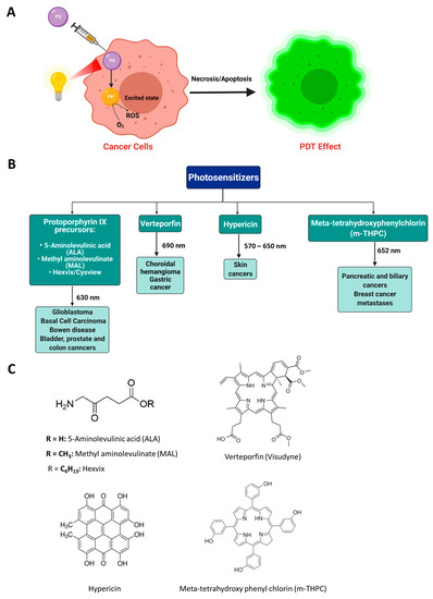 (A) General principle of photodynamic therapy; (B) FDA and/or EU-approved photosensitizers in cancer photodynamic therapy; (C) Chemical structures of approved photosensitizers. PS, photosensitizer; PS*, photosensitizer excited state.