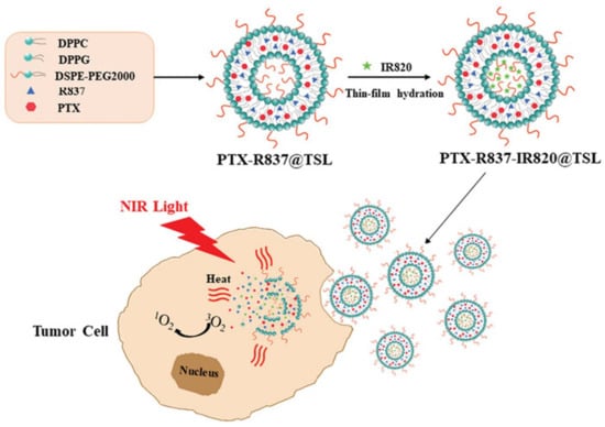 Thermosensitive liposomes loaded with IR820 PS, paclitaxel, and imiquimod (R837) [81]. DPPC, 1,2-Dipalmitoyl-sn-glycero-3-phosphocholine; DPPG, 1,2-Dipalmitoyl-sn-glycero-3-phosphoglycerol, sodium salt; 1,2-distearoyl-sn-glycero-3-phosphoethanolamine-N-[amino(polyethylene glycol)-2000] (ammonium salt); R827, imiquimod; PTX, Paclitaxel; IR820, photosensitizer. Reprinted with permission from ref. [82]. 2019 Meng et al.