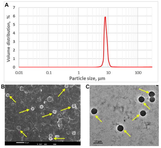 For scanning electron microscopy (SEM), the microspheres were placed on carbon conductive adhesive tape mounted on the specimen stub. The mounted sample was frozen at −190 °C in liquid nitrogen and transferred to the preparation chamber, maintained at −130 °C, and sublimed at −90 °C for 10 min, followed by coating with platinum [27]. It was then transferred to the SEM chamber for viewing at −150 °C with an accelerating voltage of 5.0 kV (JSM-7600F field emission gun SEM equipped with Cryo unit (PP3000T) by Quorum). For transmission electron microscopy (TEM), the microspheres were mounted on a carbon-coated formvar grid, stained with neutralized 2% phosphotungstic acid and dried before imaging [28].