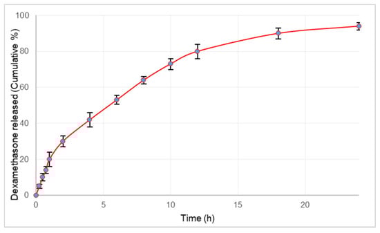 Release profile of dexamethasone from microspheres over a period of 24 h. Values plotted are the mean of 6 determinations and error bars indicate standard deviation.