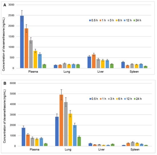 Biodistribution of dexamethasone in various organs namely, liver, lungs, and spleen (ng/g) and plasma (ng/mL) of rats at different time intervals over a period of 24 h after intravenous injection of (A) Conventional marketed injection of dexamethasone and (B) Dexamethasone-loaded lipopolymeric microspheres. Values are the mean of 3 determinations and error bars indicate standard deviation.