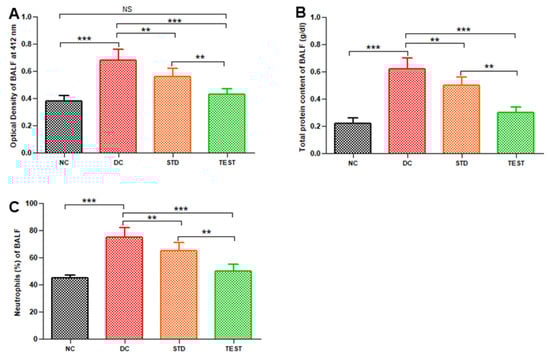 Pulmonary haemorrhage in terms of optical density of BALF (A), total protein (B), and neutrophil (C) in BALF from various groups namely, Normal Control (NC), Disease Control (DC), standard treatment of conventional dexamethasone injection (STD), and test formulation treatment with dexamethasone microspheres (TEST) (n = 6). ** and *** represent significant differences at p < 0.01 and p < 0.001, respectively, by Newman–Keuls analysis following ANOVA at 95% confidence limit. NS = Non-significant.