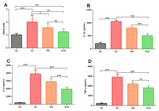 Levels of lipid peroxidation and various inflammatory markers in BALF from various groups namely, Normal Control (NC), Disease Control (DC), standard treatment with conventional dexamethasone injection (STD) and test formulation treatment with dexamethasone microspheres (TEST) (n = 6) (A) TBARS, (B) IL-1β, (C) IL-6, and (D) TNF-α. *, **, and *** represents significant difference at p < 0.05 and p < 0.01 and p < 0.001, respectively, by Newman–Keuls analysis following ANOVA at 95% confidence limit. NS = Not significant.