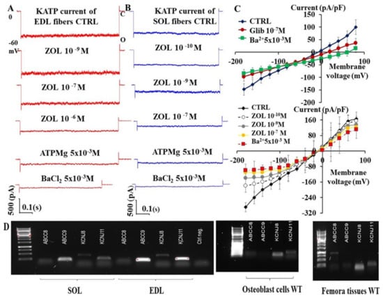 Moreover, ZOL (10−10–10−7 M) was able to inhibit the currents recorded in the cell-attached patches of primary bone cells from long bones or calvaria, either at positive or negative membrane potential (Figure 1C). ZOL caused a full reduction of the channel current at subnanomolar concentrations, similar to SOL fibers. PCR analysis revealed an abundant presence of Abcc9 and KcnJ11 in EDL but a lower expression level in SOL muscles, as previously reported [31] (Figure 1D). Furthermore, we found an abundant presence of Kcnj8 in either bone cells or bone tissue (Figure 1D).