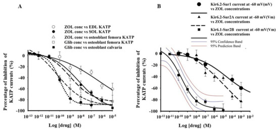 Different potencies have been observed after the application of ZOL (10−12–10−4 M) to EDL, SOL, and primary bone cells from the femora (Figure 2A). The IC50 values of ZOL in the primary bone cells from femora were comparable with that of this drug in SOL fibers (Table 1). Moreover, in these cells, the application of glibenclamide (10−12–10−4 M) concentration-dependently inhibited the KATP currents in C-A patches. The IC50 of glibenclamide to inhibit the KATP current in primary bone cells was comparable with that of SOL fibers (Table 1). The potency and efficacy of Glib in different skeletal muscles phenotypes have already been extensively investigated, and the IC50 values have already been shown to be in the nanomolar concentration range [28,31,47].