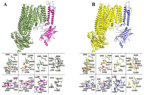 3D comparative models of KIR6.1-SUR2B human protein complex (A). Lateral views of SUR2B (dark green cartoon)-KIR6.1 (magenta cartoon) human protein complex is reported in cartoon representation. In the panels below, within the first row, ATP (green sticks), ATP-IPP (orange sticks), and zoledronic acid (cyan sticks) are reported in the SUR2B ATP binding region (dark green sticks), whereas Glib (pink sticks) is reported in the SUR2B—Glib binding region (in dark green sticks). In the panels below, within the second row, ATP (green sticks), ATP-IPP (orange sticks), and zoledronic acid (cyan sticks) are reported in the KIR6.1 ATP binding region (magenta sticks). In addition, Zoledronic acid is reported in the SUR2B-Glib binding region (dark green sticks). (B) KIR6.2-SUR2A 3D comparative models of KIR6.2-SUR2A human protein complex. Lateral views of SUR2A (yellow cartoon)-KIR6.2 (dark blue cartoon) human protein complex is reported in cartoon representation. In the panels below, within the first row, ATP (green sticks), ATP-IPP (orange sticks), and zoledronic acid (cyan sticks) are reported in the SUR2A ATP binding region (yellow sticks), whereas Glib (pink sticks) is reported in the SUR2—Glib binding region (in yellow sticks). In the panels below, within the second row, ATP (green sticks), ATP-IPP (orange sticks), and zoledronic acid (cyan sticks) are reported in the KIR6.2 ATP binding region (yellow sticks). In addition, Zoledronic acid is reported in the SUR2A-Glib binding region (yellow sticks).