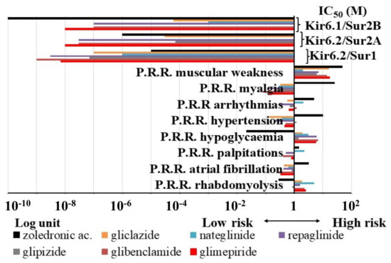 Distribution of the Proportional Reporting Ratio (P.R.R.) of different risks vs. the IC50 values of the drugs against the different recombinant KATP channel subunit combination expressed in cell lines. P.R.R. values lower than 1 indicate low risk; values higher than 1 indicate higher risk. Zoledronic acid shows a high risk for all A.D.R. apart from hypoglycaemia and rhabdomyolysis, and the highest potency against the vascular KIR6.1-SUR2B channels vs. other drugs. The sulfonylureas and glinides show a higher risk for hypoglycemia and muscular weakness, and nateglinide shows additional risks for cardiac A.D.R. and rhabdomyolysis. The sulfonylureas and glinides show the highest potency against the pancreatic KIR6.2-SUR1 channels vs. zoledronic acid except for nateglinide, which is the less potent drug within the glinides and sulfonylureas.