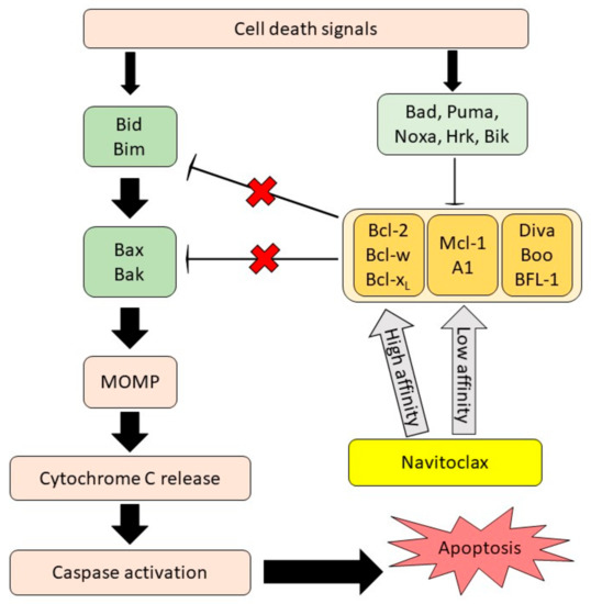 Navitoclax mechanism of action. Navitoclax potentiates the intrinsic cell death mechanism through the inhibition of anti-apoptotic proteins signal. Navitoclax affinity on anti-apoptotic proteins is varied. MOMP, mitochondrial outer membrane permeabilization, reproduced from [26], Frontiers, 2020.