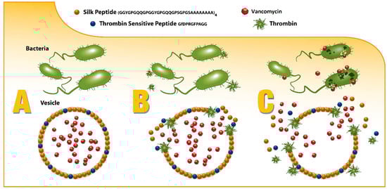 Spidroins (i.e., spider silk proteins) are a natural, structural, block copolymer, with a demonstrated combination of robust mechanical properties, biocompatibility, and a well-established structure–activity relationship, which can be easily customized according to rates of degradation to non-toxic byproducts in vivo, making them a versatile biomaterial to be increasingly considered for various biomedical and drug delivery applications [,,]. By capitalizing on this “plug-and-play” motif structure, spidroins can be directly engineered to not only incorporate the thrombin-sensitive peptide element, but also to promote self-assembly into drug-encapsulating micelles and microcapsules that can release their drug payload only in the presence of infection as depicted in Figure 1 [,,,].