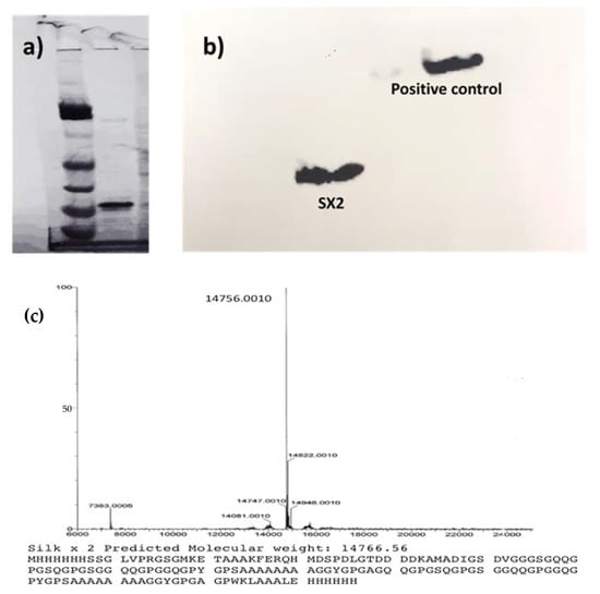 (a) SDS-PAGE of the purified protein showing the band at 15 kDa, (b) Western blot of the protein against an anti-his antibody confirms the production of the protein, (c) theoretical mass was predicted to be 14,766 Da while mass spectrometry of the silk protein was determined to be 14,756 Da.