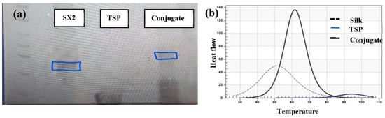 (a) SDS PAGE showing the molecular weight difference between silk and the conjugate, (b) DSC graph of silk, TSP and the conjugate showing increase in enthalpy of the conjugate.
