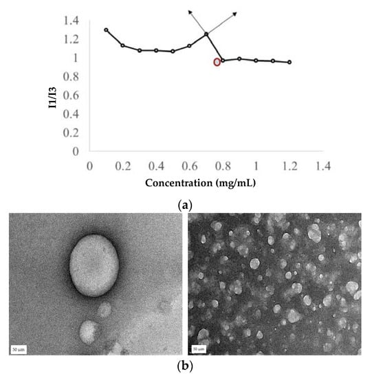 Critical aggregation concentration (CAC) of the conjugate was determined using (a) the standard pyrene fluorescence method. The concentration at the tangent on the graph, which shows a sudden fall in the intensity ratio, corresponds to the CAC (0.7 mg/mL). (b) TEM images of Vancomycin-loaded silk nanospheres show spherical nature of the particles.