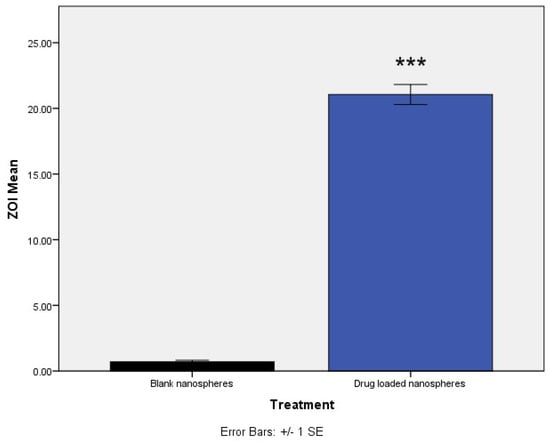 ZOI of blank and drug-loaded nanospheres at MIC (*** p < 0.001).