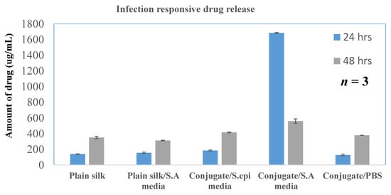 After forming the nanospheres, antibacterial activity of the formulation was evaluated by determining the MIC of the drug-loaded formulation and comparing it with the free drug. The MIC of the nanospheres was 16 µg/mL, which showed a ZOI of 19.1 mm, corresponding to standard ZOI values. Blank formulations did not show any ZOI suggesting that the drug is released from the encapsulated nanospheres to show antimicrobial activity (Figure 6). The infection-responsive release was assessed by incubating the formulations to different types of media. When exposed to the media from S. aureus, the conjugate showed a release of 85% and silk without TSP showed 15% (Figure 7), suggesting that TSP was cleaved by the bacterial enzyme to burst the nanospheres and release the drug, whereas plain silk was unable to rupture in the presence or absence of the enzyme. Furthermore, to confirm the specificity of the enzymatic release, drug-loaded formulations were also exposed to the media from S. epidermidis, which showed a release similar to PBS, suggesting that the vancomycin release was specific to the enzyme secreted from S. aureus. The drug release profile was established in the same manner of dialysis to assess whether the formulation showed an immediate release profile and the duration of release. It showed that drug release reached a maximum in 24 h (Figure 8) and started to decline throughout the remainder of the study. The release also corelates with the antibiotic release reported in the literature, which showed the maximum release of the antibiotic within 24 h of incubation []. This is again in correspondence with the initial HPLC evaluation of susceptibility of TSP, which showed that the TSP was cleaved within 12 h, although the formulation showed only 75% of release, potentially due to the saturation of the enzyme in the media.