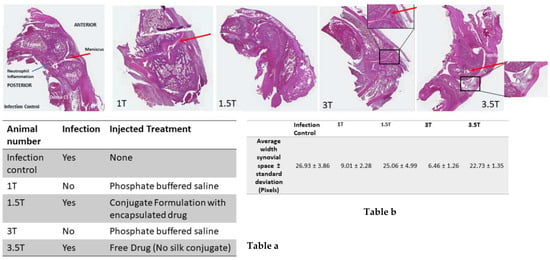 In control animals injected with S. aureus without any treatment to establish that the current method was effective at establishing an infection, there was evidence of acute inflammation by marked neutrophilic infiltration in fibrotic synovium with thickened collagen septa (Dense CT). Histopathological results additionally showed higher levels of nucleated cell infiltration and some evidence of meniscus degeneration and shape change. Alternatively, in the control animals with no infection (1T and 3T), PBS was injected to assess the tissue response to injection. Hematoxylin and Eosin (H&E) staining showed narrow synovial lining with regular borders and normal joint structures (Figure 10). Furthermore, the triangular shape of the meniscus (red arrow in each image) is intact and unremarkable. In contrast, H&E staining of an infected joint injected with drug encapsulating conjugate particles (1.5T) showed a mild degeneration of the meniscus and vast vacuolar infiltration of the distal femur just superior to the epiphyseal growth plate (star). The synovium was also widened relative to 1T, indicating some inflammation to the knee joint space; however, it is unclear if this is due to the drug or the conjugate particles, since knees injected with the free drug only showed a similar, if not more inflamed, appearance (3.5T), with evidence of some meniscus degeneration and shape changes as well as signs of marked inflammation. The arrow on 3.5T indicates cellular infiltrates and vacuolar degeneration, whereas the star shows the sub patellar fat pad. Finally, the changes in width of the synovial space from multiple images were quantified using Image J and are reported as the average of all measurements with a standard deviation (Table b in Figure 10).